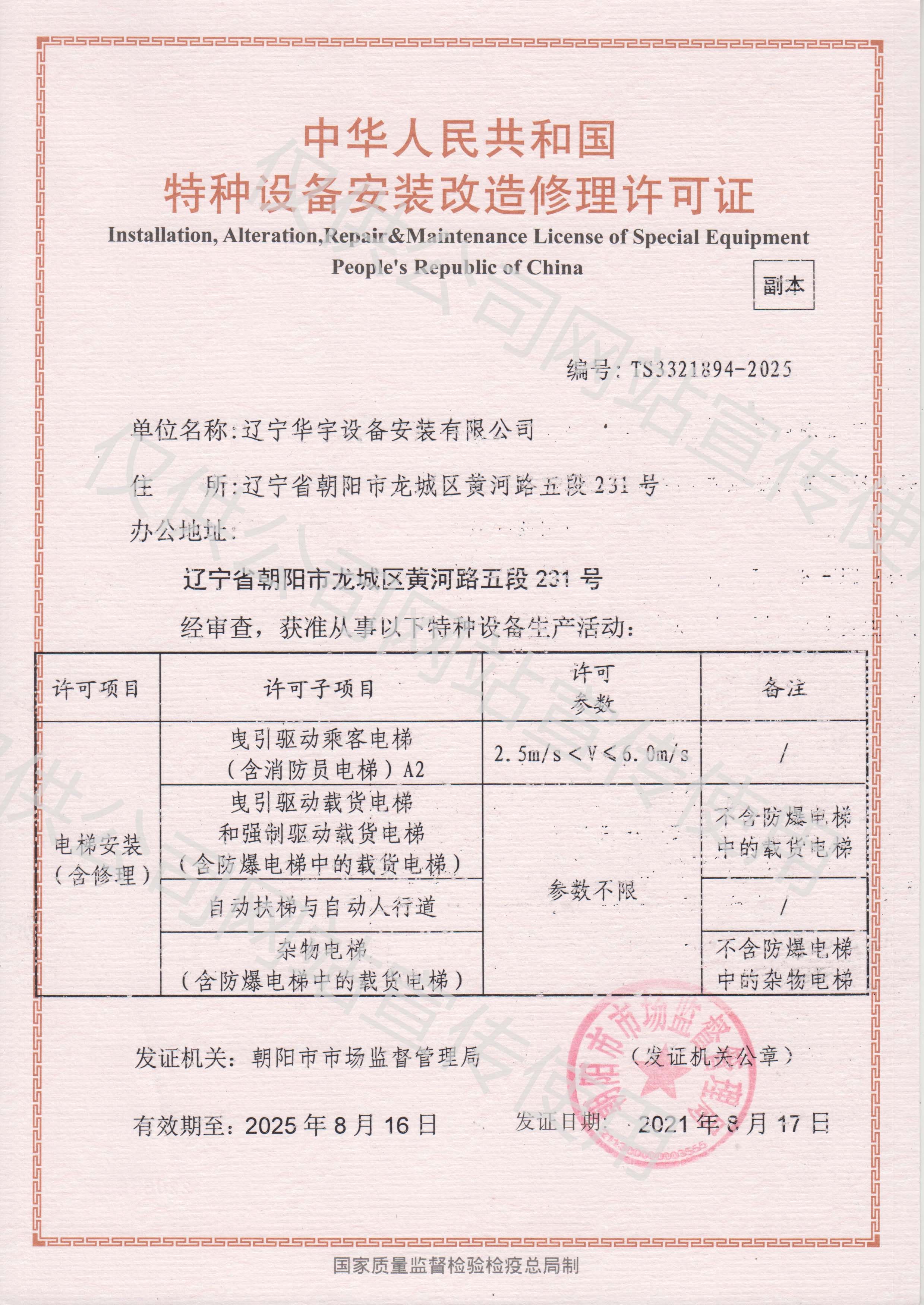 ? ? ? ?? 遼寧華宇設(shè)備安裝有限公司成立于2002年7月15日,注冊資金10000萬。公司占地面積60余畝,建筑面積4000余平。現(xiàn)取得消防設(shè)施工程專業(yè)承包一級資質(zhì)、消防設(shè)施維護保養(yǎng)檢測一級資質(zhì)、建筑機電安裝工程專業(yè)承包一級資質(zhì)、電子與智能化專業(yè)承包二級、建筑裝修裝飾工程專業(yè)承包二級、安全技術(shù)防范設(shè)施設(shè)計施工二級資質(zhì)、建筑工程施工總承包三級、電力工程施工總承包二級、輸變電工程專業(yè)承包二級資質(zhì)、電力承裝、承修、承試三級資質(zhì)、鋼結(jié)構(gòu)工程專業(yè)承包三級資質(zhì)和地基基礎(chǔ)工程專業(yè)承包三級。同時是人防工程通風(防化)設(shè)備生產(chǎn)安裝企業(yè),并具備電梯銷售、電梯安